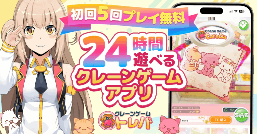 「トレバ(Toreba)」は、スマートフォンやパソコンから本物のクレーンゲームを遠隔操作して遊べるオンラインクレーンゲームサービスです。実際のゲームセンターの筐体をリアルタイム映像で操作でき、獲得した景品は自宅へ配送されます。