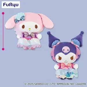 マイメロディとクロミが海の妖精のようなドレスアップで登場。約28cmサイズで、オーガンジー素材の飾りやパール付きリボンが華やかさを演出します。