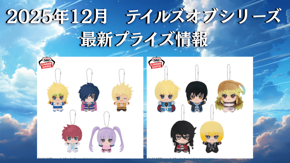 ゲームセンターのUFOキャッチャーやオンラインクレーンアプリ(オンクレ)で取れる2025年12月に登場予定の『「テイルズ オブ」シリーズ』のぬいぐるみや雑貨などのプライズ情報をまとめました!