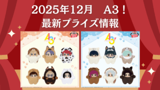 最新プライズ情報 【A3!(エースリー)】クレーンゲームのプライズ・フィギュア・ぬいぐるみ情報【2025年12月最新】| クレーンゲーム情報局(オンクレ・UFOキャッチャー) ゲームセンターのUFOキャッチャーやオンラインクレーンアプリ(オンクレ)で取れる2025年12月に登場予定の『A3!(エースリー)』のぬいぐるみや雑貨などのプライズ情報をまとめました!A3!(エースリー)のプライズが取れるオンラインクレーン... 2025.12.21 最新プライズ情報