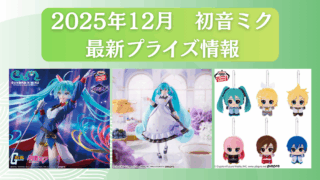 ゲームセンターのUFOキャッチャーやオンラインクレーンアプリ(オンクレ)で取れる2025年12月に登場予定の『初音ミク』のフィギュアやぬいぐるみなどのプライズ情報をまとめました!初音ミクのプライズが取れるオンラインクレーンゲーム(オンクレ)...