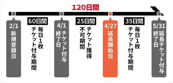 - 登録日が2025年2月1日の方は、もともと4月1日(60日目)までのチケット配布対象でした。